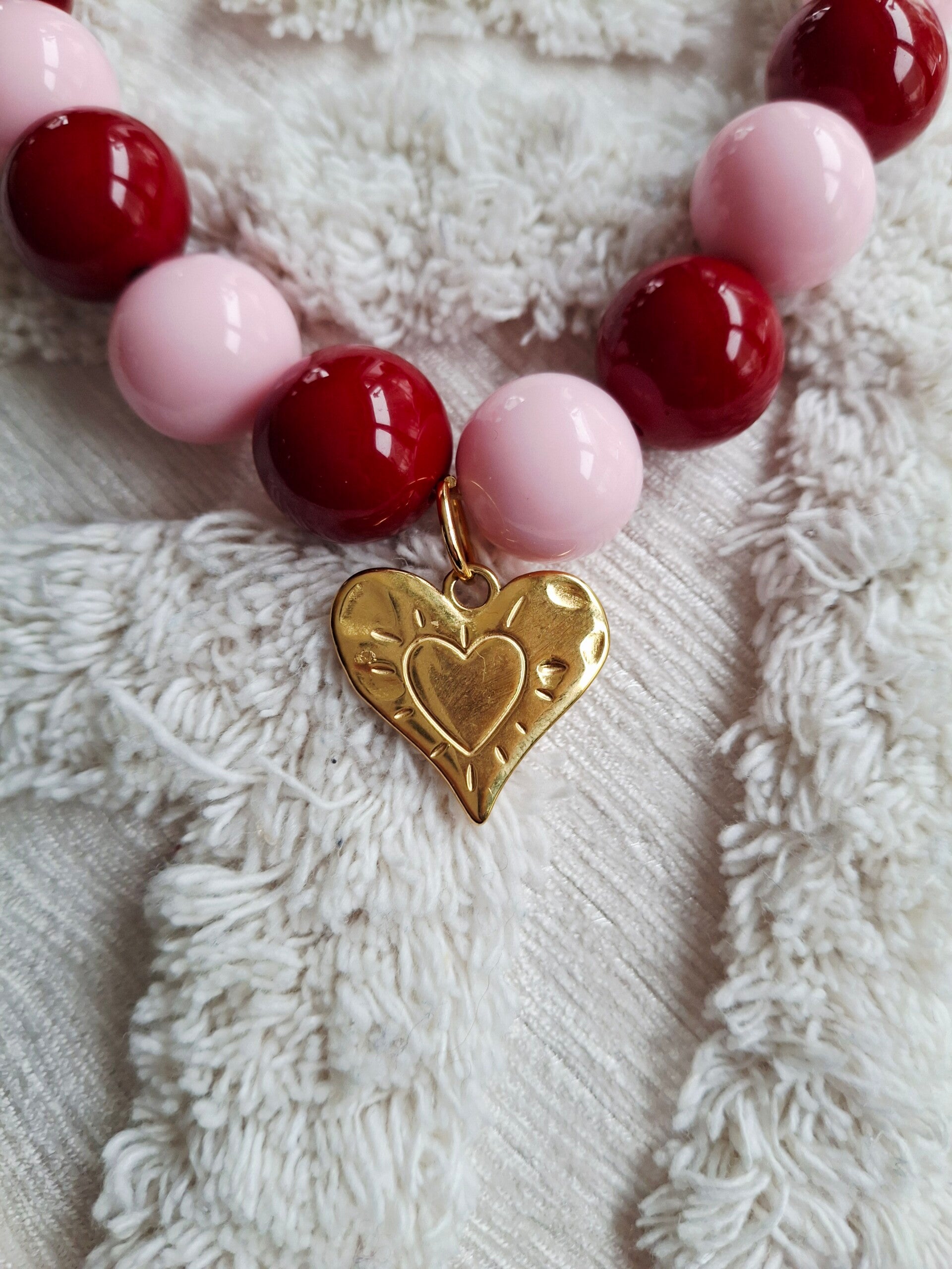 Een prachtige ketting van acryl kralen in de kleuren wijnrood met zacht roze en een stainless steel gouden bedel. De ketting 44 cm sluit met een stainless steel slotje en heeft een verlengstuk van 6 cm, zodat je haar mooi op lengte kunt dragen die bij jou past.