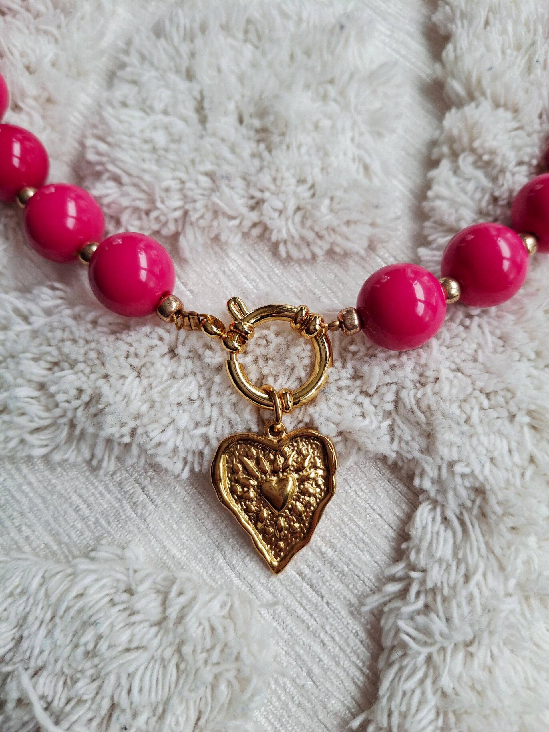 Een prachtige ketting van acryl kralen in de kleur pink met een boeislot en een bedel. Door het boeislot kan je de bedel ook wisselen door iets anders aan je ketting te hangen. De ketting is 48 cm lang.